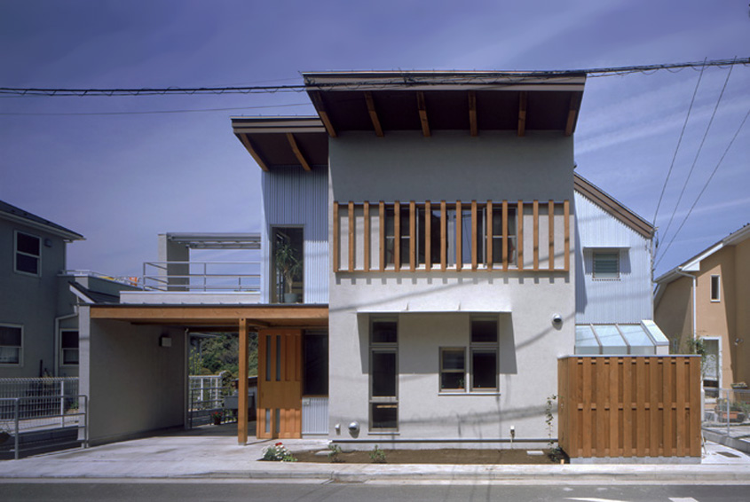 平らな部分一切無い45度に迫る急斜面の土地。更に北向かって下がる立地。この斜面ならではの発想の転換から生まれたでダイナミックなスキップフロア。 北斜面にふわりと舞い降りた採光性にも優れた軽やかな家です。